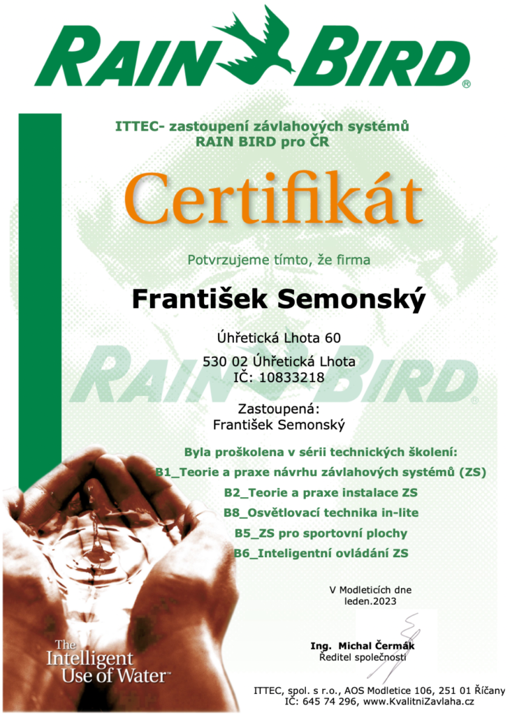 Profesionální individuální naprojektování závlahového systému zahrady (dle zdroje vody, vydatnosti vody, rozboru vody atd.), pokládku a instalaci závlahového systému, kalibrace závlahy, zaškolení a možnost servisu na dálku.